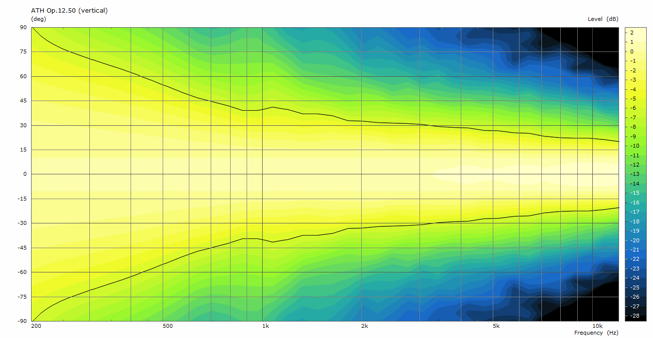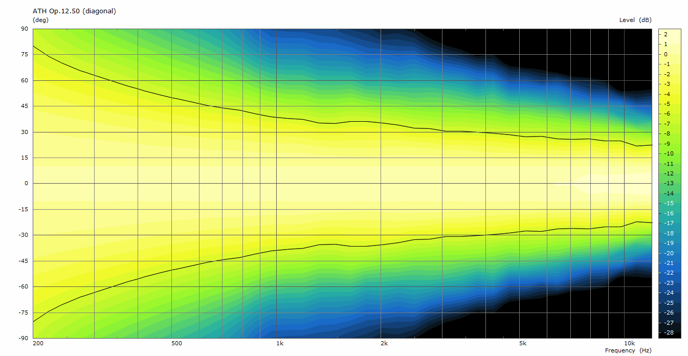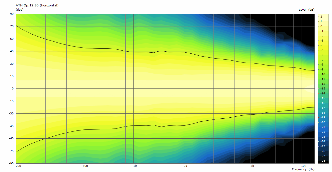 The following figures show the simulated polar responses of the Op.12.50 for the horizontal, vertical and diagonal orbits, with the -6 dB contour lines marked black (the images can be manually opened in a new window to see the full detail). No additional smoothing of the data has been applied, so there may still be a bit of numerical noise apparent.