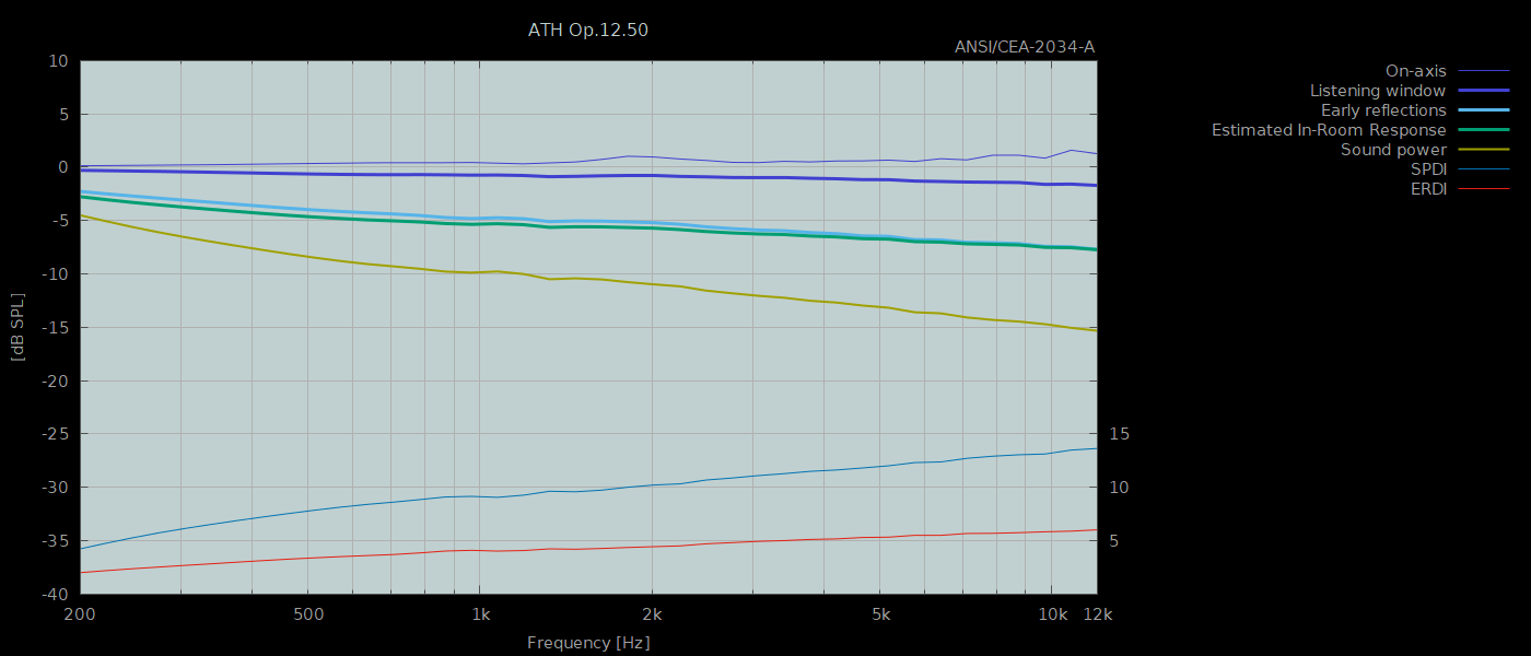 The overall acoustic response, including the total radiated sound power, is extremely smooth and linear across the whole band. This ensures that both the direct sound and the reverberant sound field in the room remain spectrally neutral. The performances of all the three versions, expressed in terms of the ANSI/CEA-2034-A standard are shown in the next figures. The downward slope of the total radiated power curve (approx. -10 dB from 200 Hz to 10 kHz) means that the direct sound can be kept spectrally flat, which corresponds to a typical target for optimized room-correction systems.